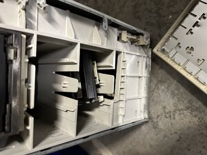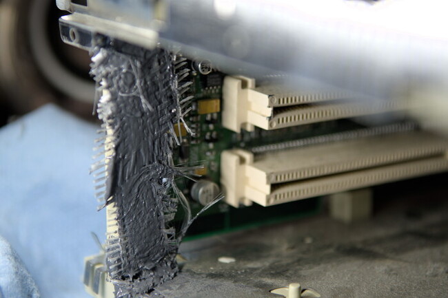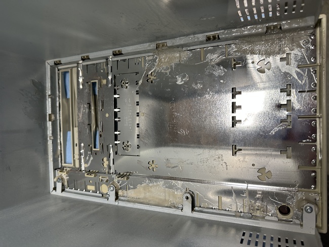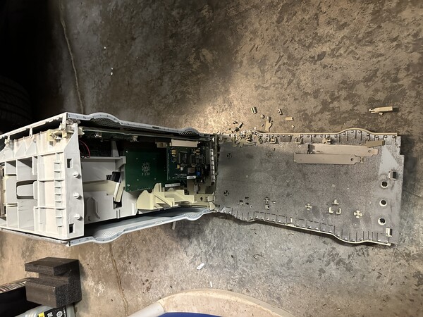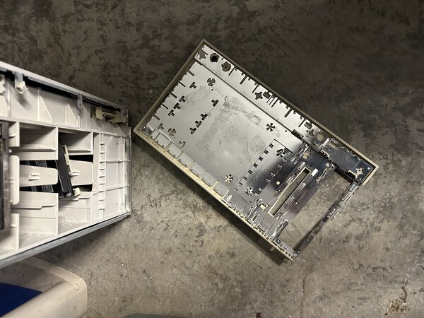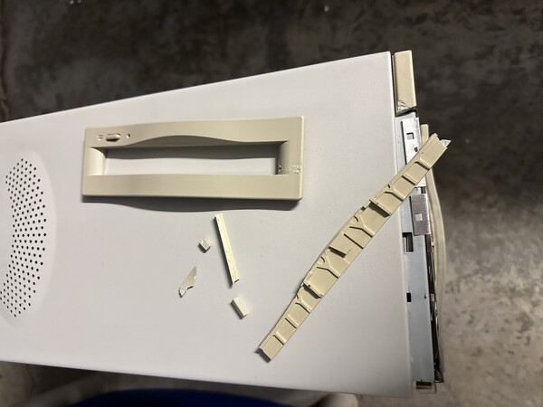 Doing a power on test revealed the machine still worked, even booted from the SCSI drive that took a direct hit and was knocked out of its carrier! So my choices were to turn this into a parts machine, try to get some kind of insurance out of UPS (unlikely), eWaste or attempt to mend the plastic. I decided on the last choice. The goal is to have it still be serviceable (those capacitors will need replaced at some point) and have it look presentable. As a rule I don't do RetroBrite since it casues the plastic to turn brittle, something this machine has enough of already, and generally it just re-yellows faster anyway.